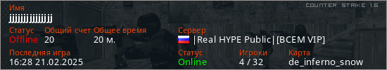 Играет на Counter Strike 1.6 сервере. Страна: РоссияПервый раз замечен 15:45 21.02.2025