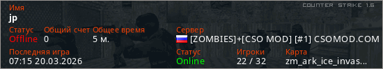 Играет на Counter Strike 1.6 сервере. Страна: РоссияПервый раз замечен 07:13 20.03.2026