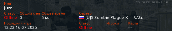 Играет на Counter Strike 1.6 сервере. Страна: РоссияПервый раз замечен 12:20 16.07.2025