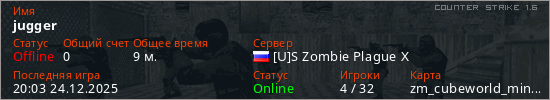 Играет на Counter Strike 1.6 сервере. Страна: РоссияПервый раз замечен 20:23 21.12.2025