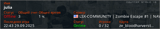 Последний раз был в сети 22:43 29.09.2025 Игрок с таким ником замечен на 15 серверах