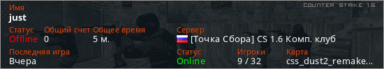 Играет на Counter Strike 1.6 сервере. Страна: РоссияПервый раз замечен 22:24 20.04.2026