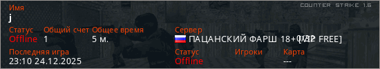 Играет на Counter Strike 1.6 сервере. Страна: РоссияПервый раз замечен 22:39 24.12.2025