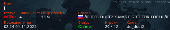 Играет на Counter Strike Global Offensive сервере. Страна: РоссияПервый раз замечен 18:50 31.10.2025