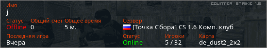 Играет на Counter Strike 1.6 сервере. Страна: РоссияПервый раз замечен 20:54 24.04.2026