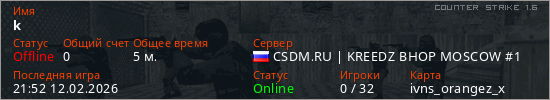 Играет на Counter Strike 1.6 сервере. Страна: РоссияПервый раз замечен 21:50 12.02.2026