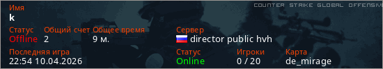 Играет на Counter Strike Global Offensive сервере. Страна: РоссияПервый раз замечен 19:00 30.03.2026