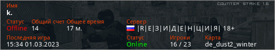Играет на Counter Strike 1.6 сервере. Страна: РоссияПервый раз замечен 14:30 01.03.2023