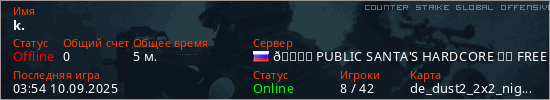 Играет на Counter Strike Global Offensive сервере. Страна: РоссияПервый раз замечен 03:48 10.09.2025