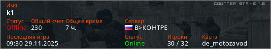 Играет на Counter Strike 1.6 сервере. Страна: РоссияПервый раз замечен 03:42 23.11.2019