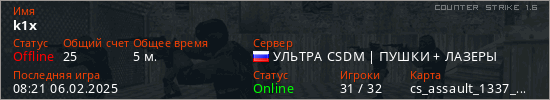 Играет на Counter Strike 1.6 сервере. Страна: РоссияПервый раз замечен 06:44 06.02.2025