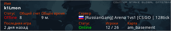 Играет на Counter Strike Global Offensive сервере. Страна: РоссияПервый раз замечен 17:18 30.01.2026