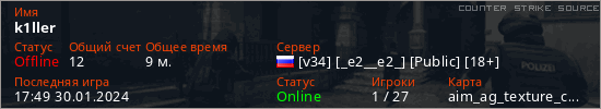 Играет на Counter Strike Source сервере. Страна: РоссияПервый раз замечен 17:39 30.01.2024