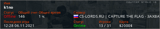 Играет на Counter Strike 1.6 сервере. Страна: РоссияПервый раз замечен 17:51 02.11.2021