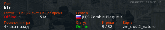 Играет на Counter Strike 1.6 сервере. Страна: РоссияПервый раз замечен 19:22 22.03.2026
