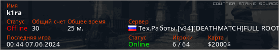 Играет на Counter Strike Source сервере. Страна: РоссияПервый раз замечен 01:32 26.07.2023