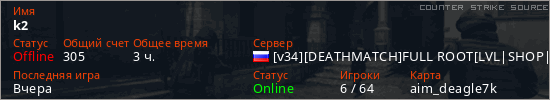 Играет на Counter Strike Source сервере. Страна: РоссияПервый раз замечен 18:57 20.02.2023