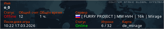 Играет на Counter Strike Global Offensive сервере. Страна: РоссияПервый раз замечен 13:03 06.03.2026