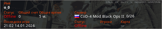 Играет на Call of Duty 4: Modern Warfare сервере. Страна: РоссияПервый раз замечен 20:47 14.01.2026