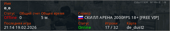 Играет на Counter Strike 1.6 сервере. Страна: РоссияПервый раз замечен 21:05 19.02.2026