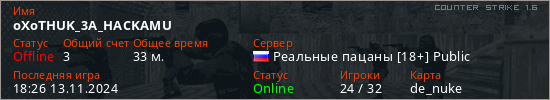 Последний раз был в сети 18:26 13.11.2024 Игрок с таким ником замечен на 30 серверах