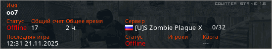 Играет на Counter Strike 1.6 сервере. Страна: РоссияПервый раз замечен 13:09 11.08.2021