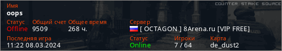 Играет на Counter Strike Source сервере. Страна: РоссияПервый раз замечен 12:51 19.03.2020