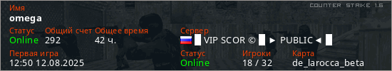 Играет на Counter Strike 1.6 сервере. Страна: РоссияПервый раз замечен 12:50 12.08.2025