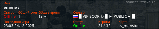 Играет на Counter Strike 1.6 сервере. Страна: РоссияПервый раз замечен 19:39 23.12.2025