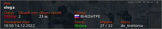 Играет на Counter Strike 1.6 сервере. Страна: РоссияПервый раз замечен 11:47 27.01.2022