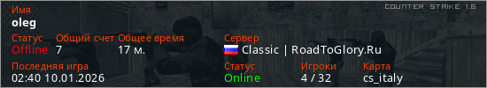 Играет на Counter Strike 1.6 сервере. Страна: РоссияПервый раз замечен 03:20 07.01.2026