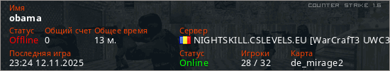 Последний раз был в сети 23:24 12.11.2025 Игрок с таким ником замечен на 22 серверах
