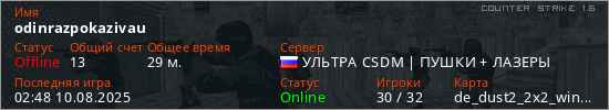 Играет на Counter Strike 1.6 сервере. Страна: РоссияПервый раз замечен 14:03 20.02.2024