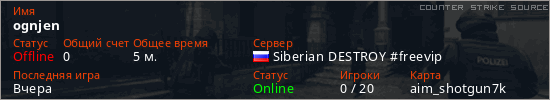 Играет на Counter Strike Source сервере. Страна: РоссияПервый раз замечен 02:20 21.03.2026
