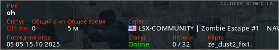 Играет на Counter Strike 1.6 сервере. Страна: СШАПервый раз замечен 04:57 15.10.2025