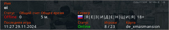 Играет на Counter Strike 1.6 сервере. Страна: РоссияПервый раз замечен 11:13 29.11.2024