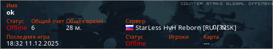 Играет на Counter Strike Global Offensive сервере. Страна: РоссияПервый раз замечен 17:40 26.10.2025