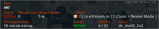 Играет на Counter Strike 1.6 сервере. Страна: РумынияПервый раз замечен 15:04 26.03.2026