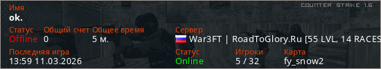 Играет на Counter Strike 1.6 сервере. Страна: РоссияПервый раз замечен 13:55 11.03.2026