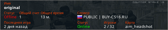 Играет на Counter Strike 1.6 сервере. Страна: РоссияПервый раз замечен 20:39 15.03.2026