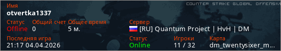 Играет на Counter Strike Global Offensive сервере. Страна: РоссияПервый раз замечен 21:15 04.04.2026