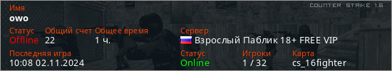 Играет на Counter Strike 1.6 сервере. Страна: РоссияПервый раз замечен 11:33 18.07.2024