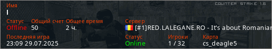 Играет на Counter Strike 1.6 сервере. Страна: РумынияПервый раз замечен 15:03 28.06.2022
