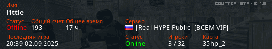 Играет на Counter Strike 1.6 сервере. Страна: РоссияПервый раз замечен 19:32 26.11.2024