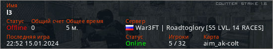 Играет на Counter Strike 1.6 сервере. Страна: РоссияПервый раз замечен 22:00 15.01.2024
