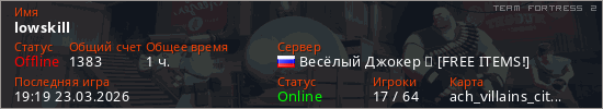 Играет на Team Fortress 2 сервере. Страна: РоссияПервый раз замечен 19:55 09.03.2026