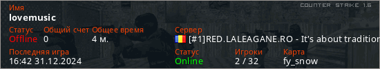 Играет на Counter Strike 1.6 сервере. Страна: РумынияПервый раз замечен 16:38 31.12.2024