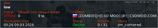 Играет на Counter Strike 1.6 сервере. Страна: РоссияПервый раз замечен 23:33 02.03.2026