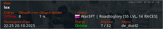 Последний раз был в сети 22:25 20.10.2025 Игрок с таким ником замечен на 41 сервере