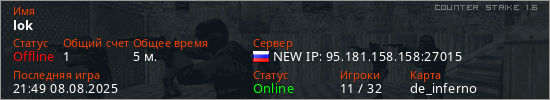 Играет на Counter Strike 1.6 сервере. Страна: РоссияПервый раз замечен 21:12 08.08.2025